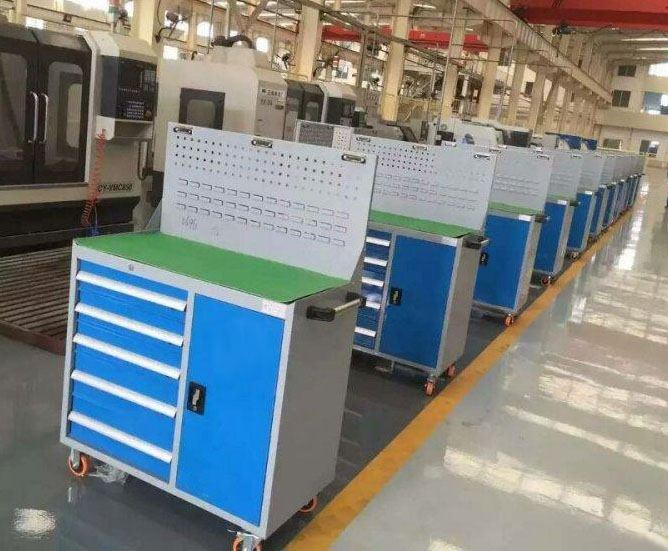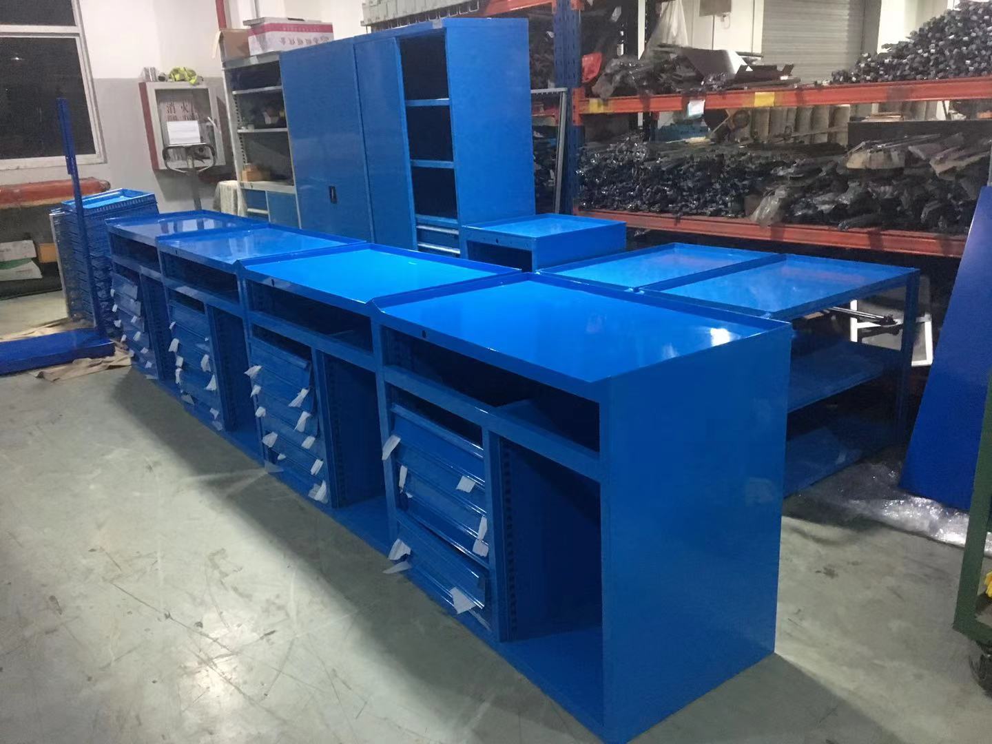 工具車適用于工具、刀具、零部件在生產(chǎn)現(xiàn)場(chǎng)中的定置管理,使您的物品存取工作真正做到準(zhǔn)時(shí)、準(zhǔn)確、高效、低耗。 結(jié)構(gòu)特點(diǎn) 編輯 1、 高強(qiáng)度的結(jié)構(gòu)設(shè)計(jì)和噴粉表面處理工藝,能適應(yīng)工廠較復(fù)雜的工作環(huán)境。 2、 裝有優(yōu)質(zhì)軸承和導(dǎo)軌,保證抽屜承受額定載荷時(shí)亦能輕松順暢開合。 3、 根據(jù)需要可自由選擇配置不同高度的抽屜,充分滿足生產(chǎn)現(xiàn)場(chǎng)的需要。 4、 可以配置帶有防油膠墊的頂框,保護(hù)放置物品不受損害以及防止物品滑落。 5、 鎖具先進(jìn),只用一把鎖就能鎖上所有的抽屜,保證物品安全。 6、 柜體底部配有墊腳,保護(hù)柜體在放置或移動(dòng)時(shí)不受損壞,方便用叉車搬運(yùn)。 多種表面顏色,滿足生產(chǎn)現(xiàn)場(chǎng)整體布置的需求 7. 全寬型鋁合金抽屜把手及可更換的標(biāo)簽,美觀、方便、實(shí)用。 8. 先進(jìn)的抽屜安全扣設(shè)計(jì),保證抽屜在關(guān)閉后不會(huì)意外滑出。 9. 更有4種國際標(biāo)準(zhǔn)色以供選擇(ral5005,ral5015,ral6011,ral7035),滿足生產(chǎn)現(xiàn)場(chǎng)整體布置的需要。 10. 采用國際先進(jìn)水平鎖具,只一把鎖就能鎖上所有抽屜,保證物品安全。 11. 加底框及高品質(zhì)的腳輪,推行平穩(wěn),方向性好,剎車固定后不會(huì)滑動(dòng)。 12. 先進(jìn)的互鎖裝置,在打開一個(gè)抽屜時(shí)其他抽屜自動(dòng)鎖死不能打開,防止抽屜全部打開造成柜體傾斜。 13.工具車的工作臺(tái)面采用獨(dú)特的注塑成型,強(qiáng)度更高。 14.中央鎖采用環(huán)形鎖匙結(jié)構(gòu),可延長鎖的使用壽命。 15.工具車四角都配有新型復(fù)合材料制成的防撞條,能有效的緩沖意外碰撞造成的損害。 16.工具車的重型車輪,125MM直徑更容易跨越障礙物。 17.臺(tái)面有特殊的小凹槽,可用來盛放黃油等液體,方便使用。 18.工具車抽屜內(nèi)可以存放豐富的工具模塊。 19.抽屜兩側(cè)采用疊加式滾珠滑軌,具有優(yōu)秀的順暢度。 20.工具車的每個(gè)抽屜擁有自鎖功能。 21.工具車兩側(cè)采用網(wǎng)孔板內(nèi)加鋼板的雙層鋼板設(shè)計(jì),使車體更加堅(jiān)固,持久耐用。 工具車與工具柜的區(qū)別 工具車是可以移動(dòng)的工具柜,適合在生產(chǎn)現(xiàn)場(chǎng)安全、合理地運(yùn)送工具和配件。 工具車由各種型號(hào)的工具柜增加頂柜和腳輪等移動(dòng)部件組成。 工具車的外型尺寸的高度:重型工具車為所選用的工具柜的高度加上140mm;輕型工具車為所造工具柜高度加上80mm。高強(qiáng)度的結(jié)構(gòu)設(shè)計(jì)和陰極電泳底漆表面處理工藝,能適應(yīng)工廠較復(fù)雜的工作環(huán)境。